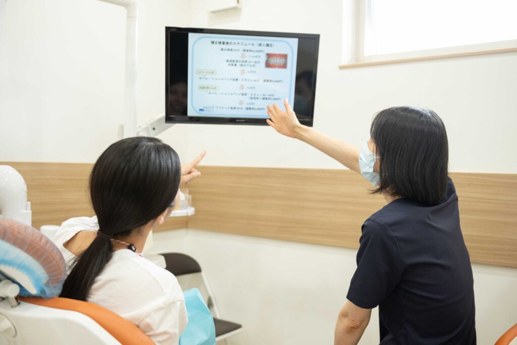 当院では、成人矯正治療を受けられる患者さん、検討されている患者さんに対して、上の写真のようにスライド等を用いて、治療費や治療期間についての詳細をお伝えしています。